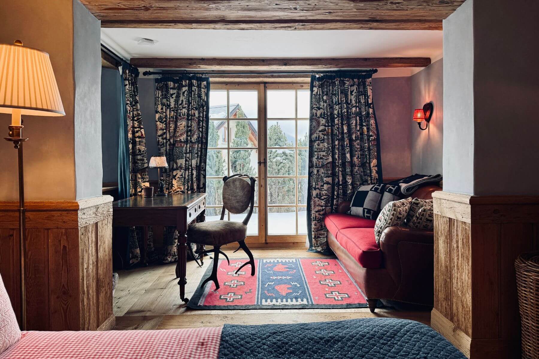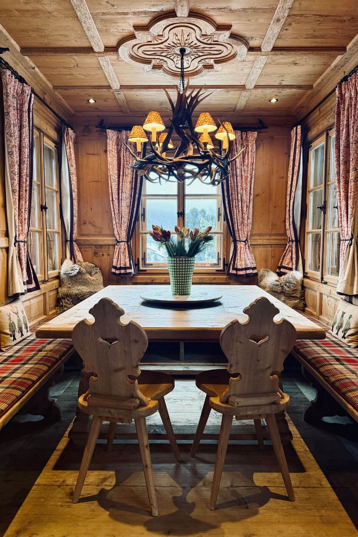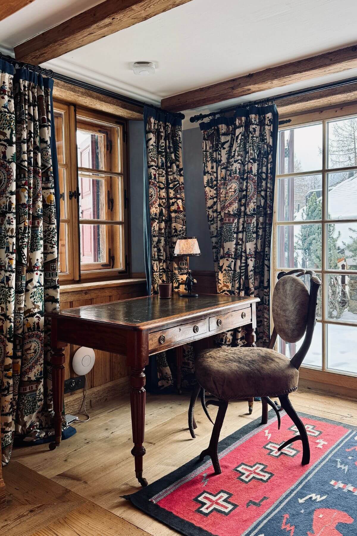 Chesa Goodmountain is nestled on a hillside overlooking the picturesque mountain village of Samedan. In the heart of the village, traditional rows of houses adorned with intricate Sgraffito create charming, postcard-perfect scenes.